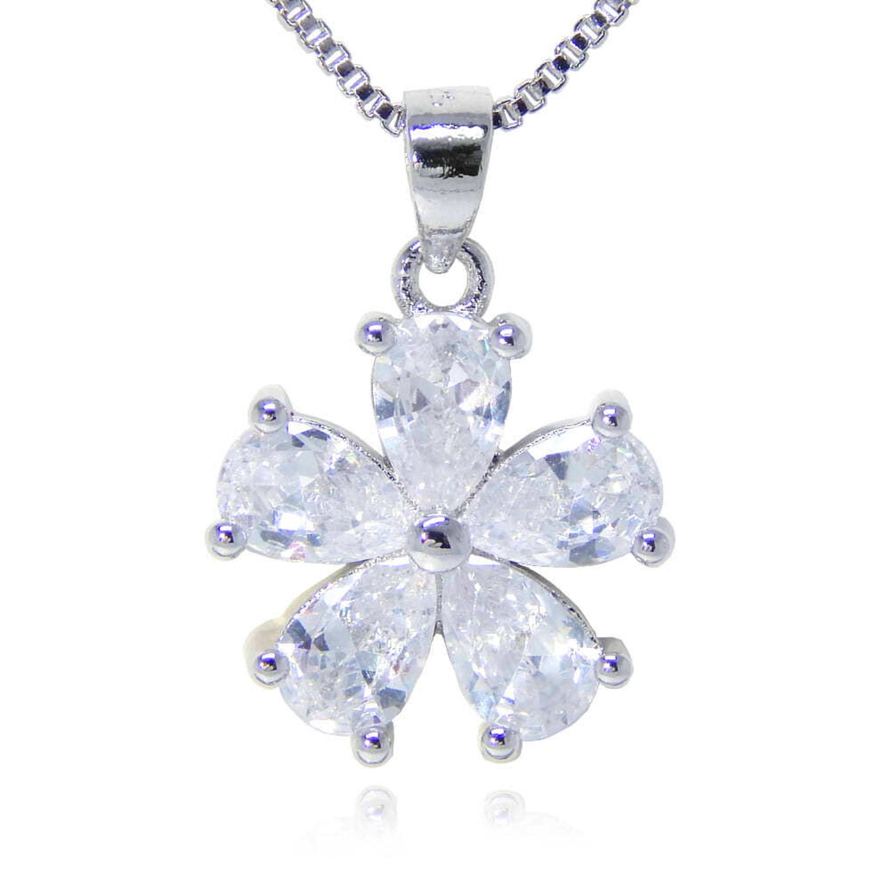 輝き溢れる5連のCZジルコニアが美しい、5連CZ5A級ジルコニアペンダントレディースネックレス。AAAAA級ブリリアントカットで仕上げられたフラワーモチーフが、華やかさをプラスしてくれます。ネックレスの長さも調節可能なので、どんなスタイルにもマッチします。