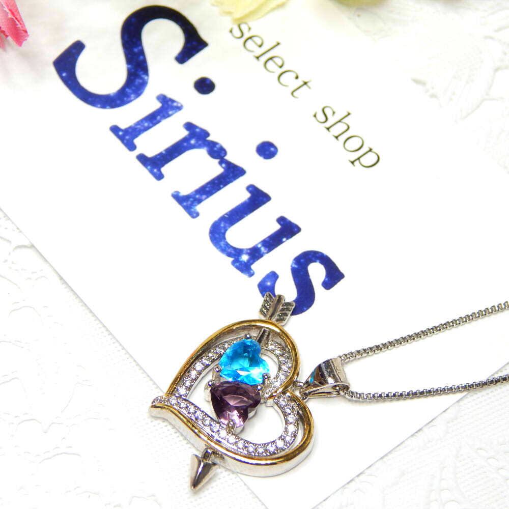 【NC-C3】❀2連ダブルハートスカイブルー&アメジストパープルCZネックレス❀シルバー925❀