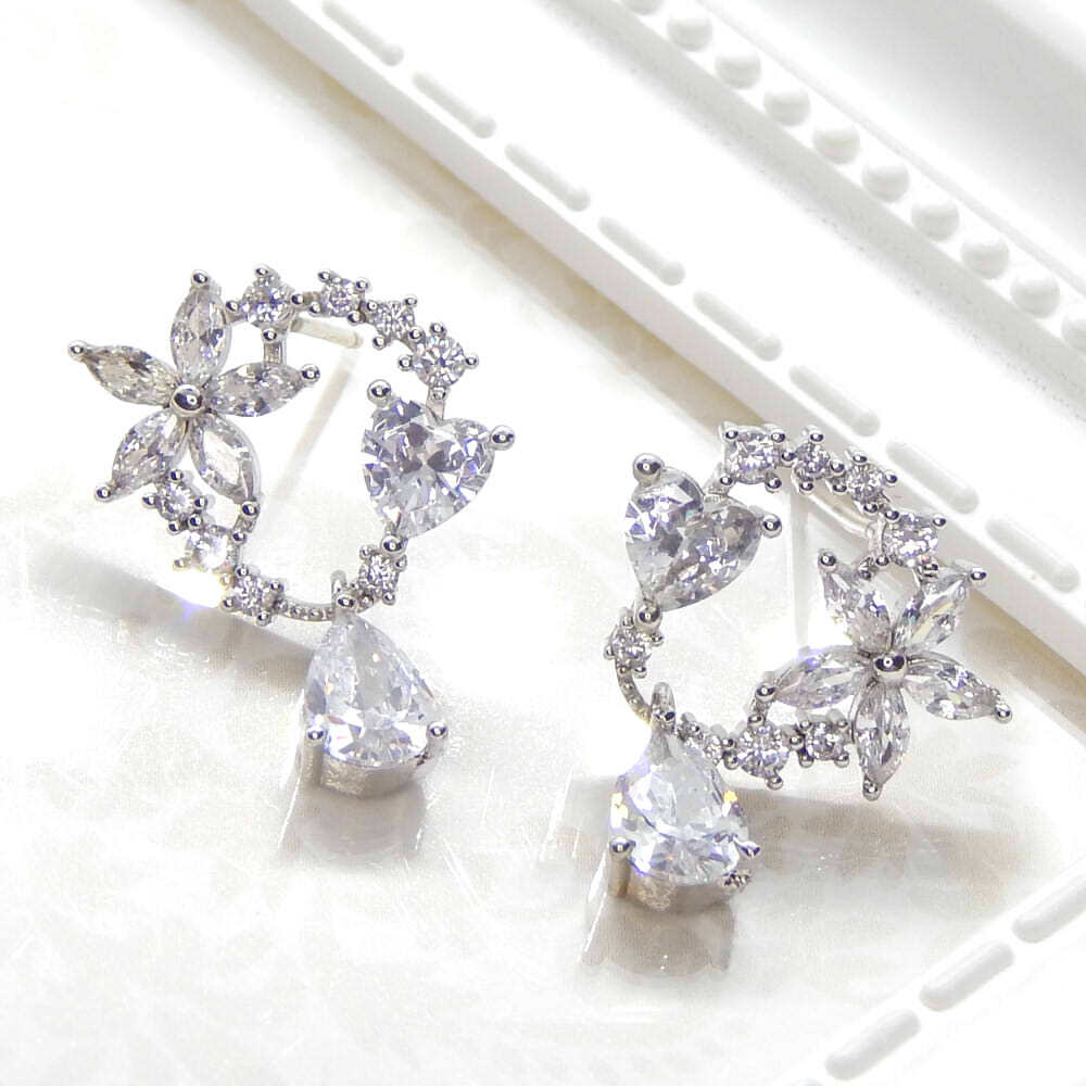 【P1-37】❀フラワー&ハート揺れるCZジルコニアピアス❀