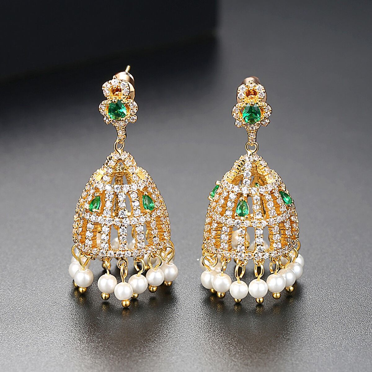 【予約】❀ゴールドシャンデリアデザインエメラルドグリーンジルコニアピアス❀